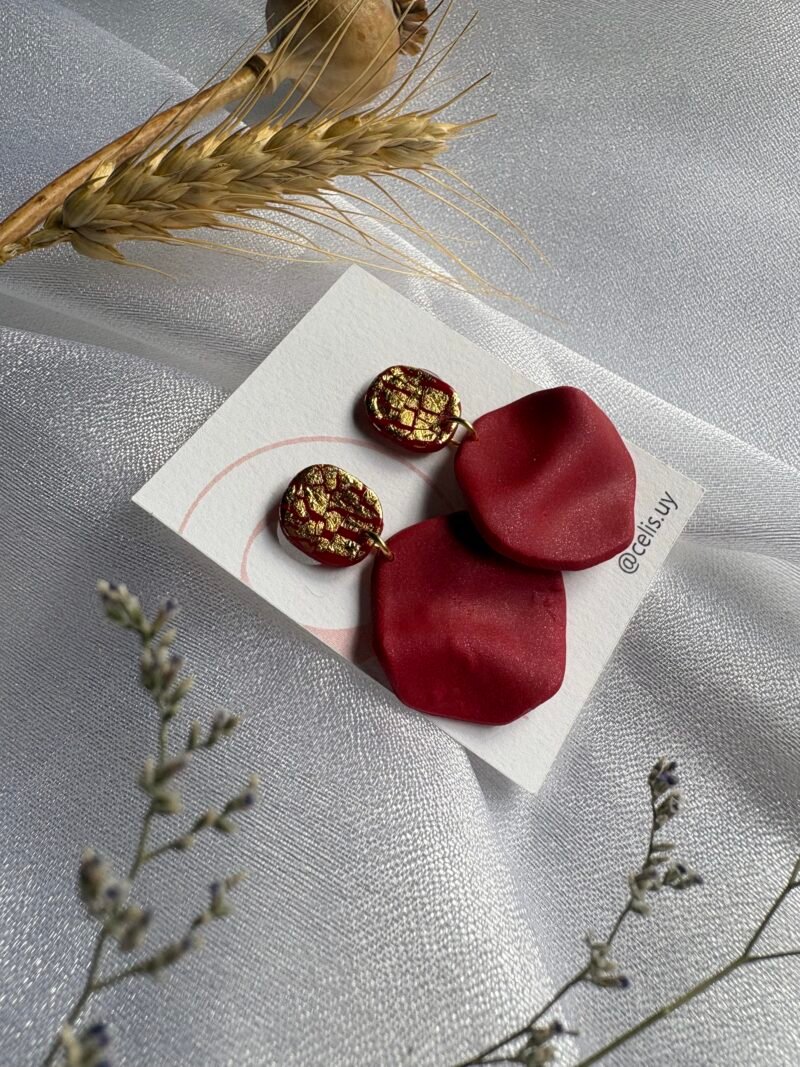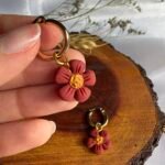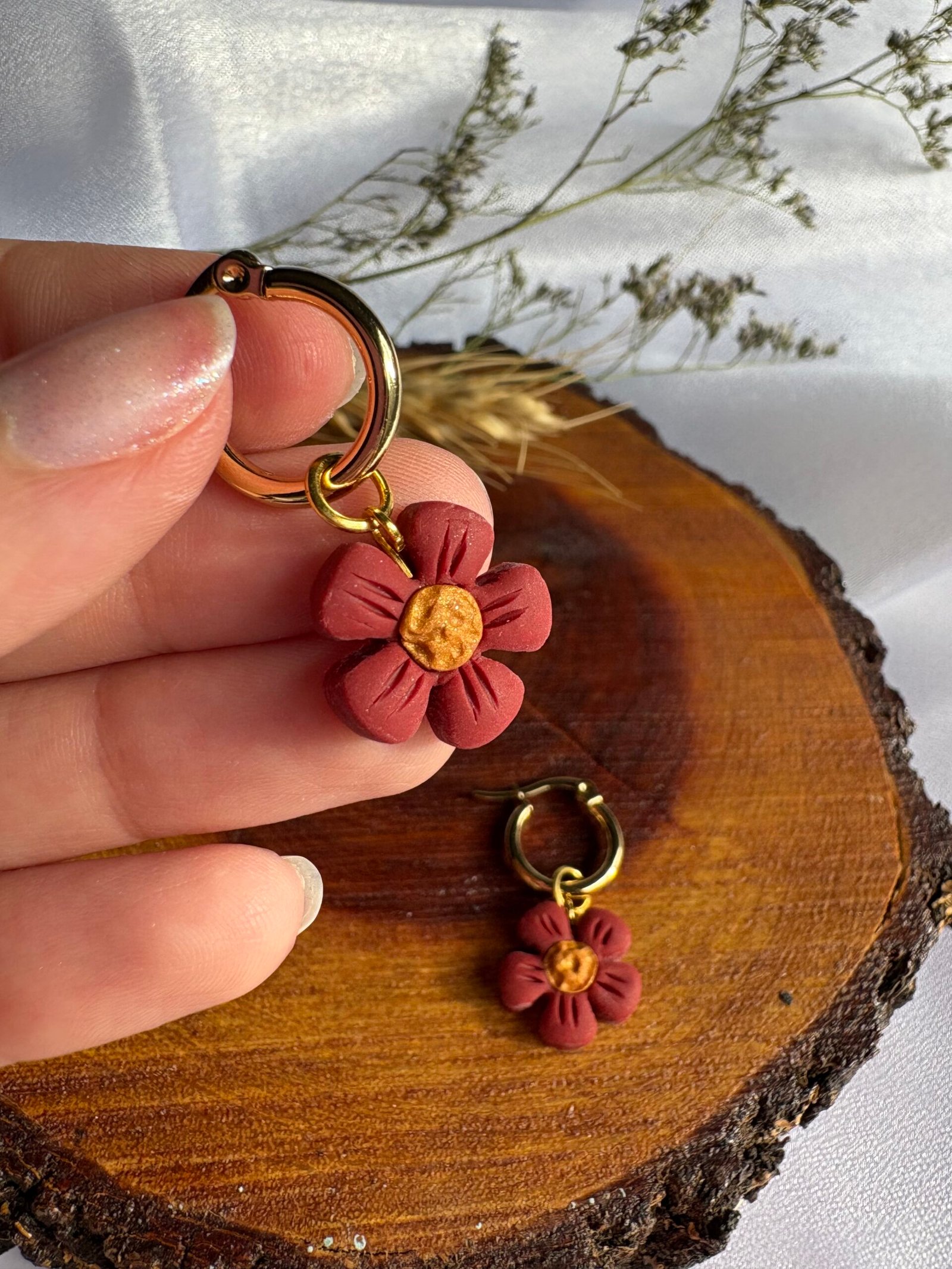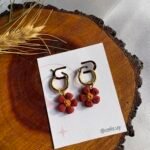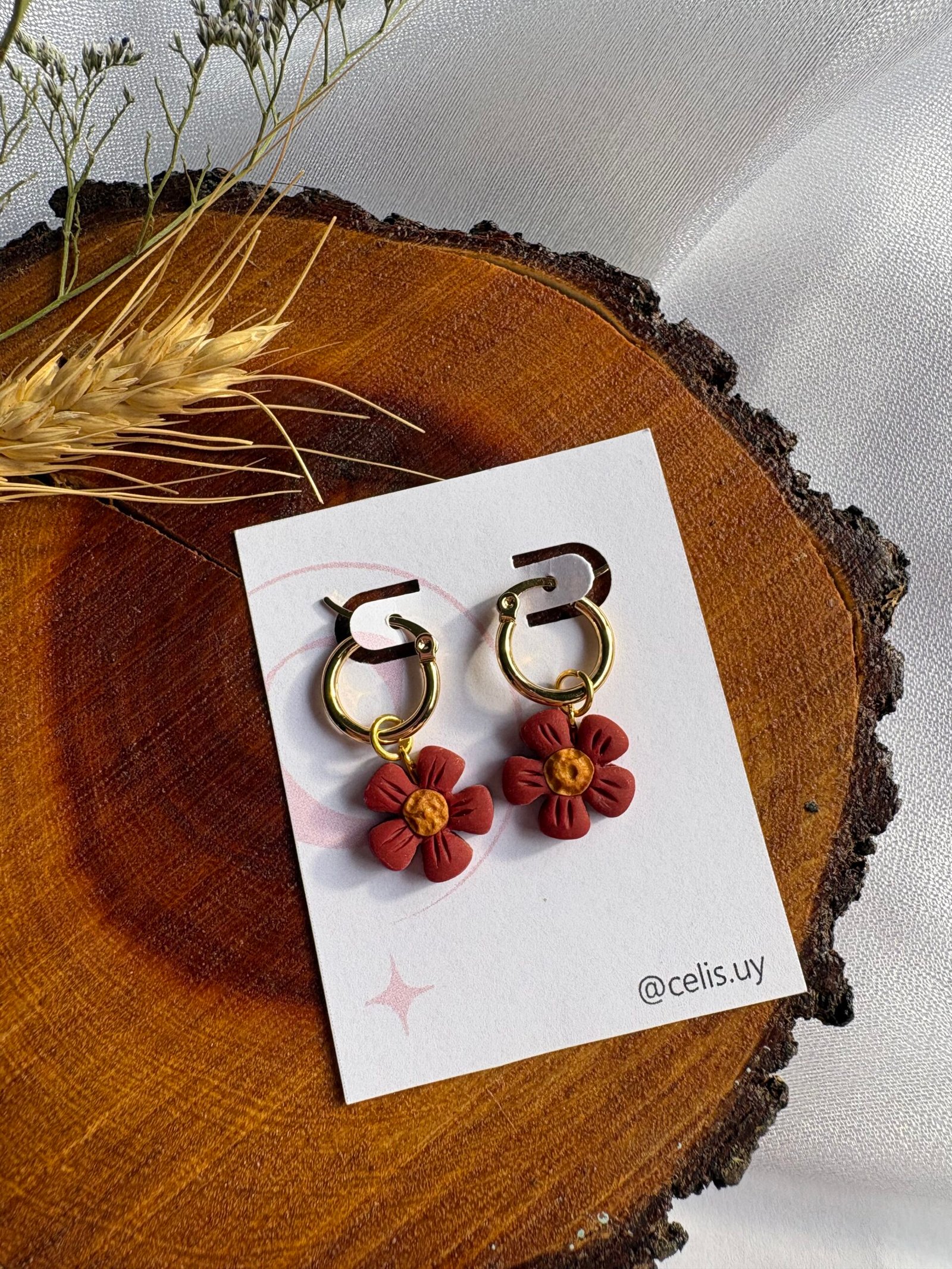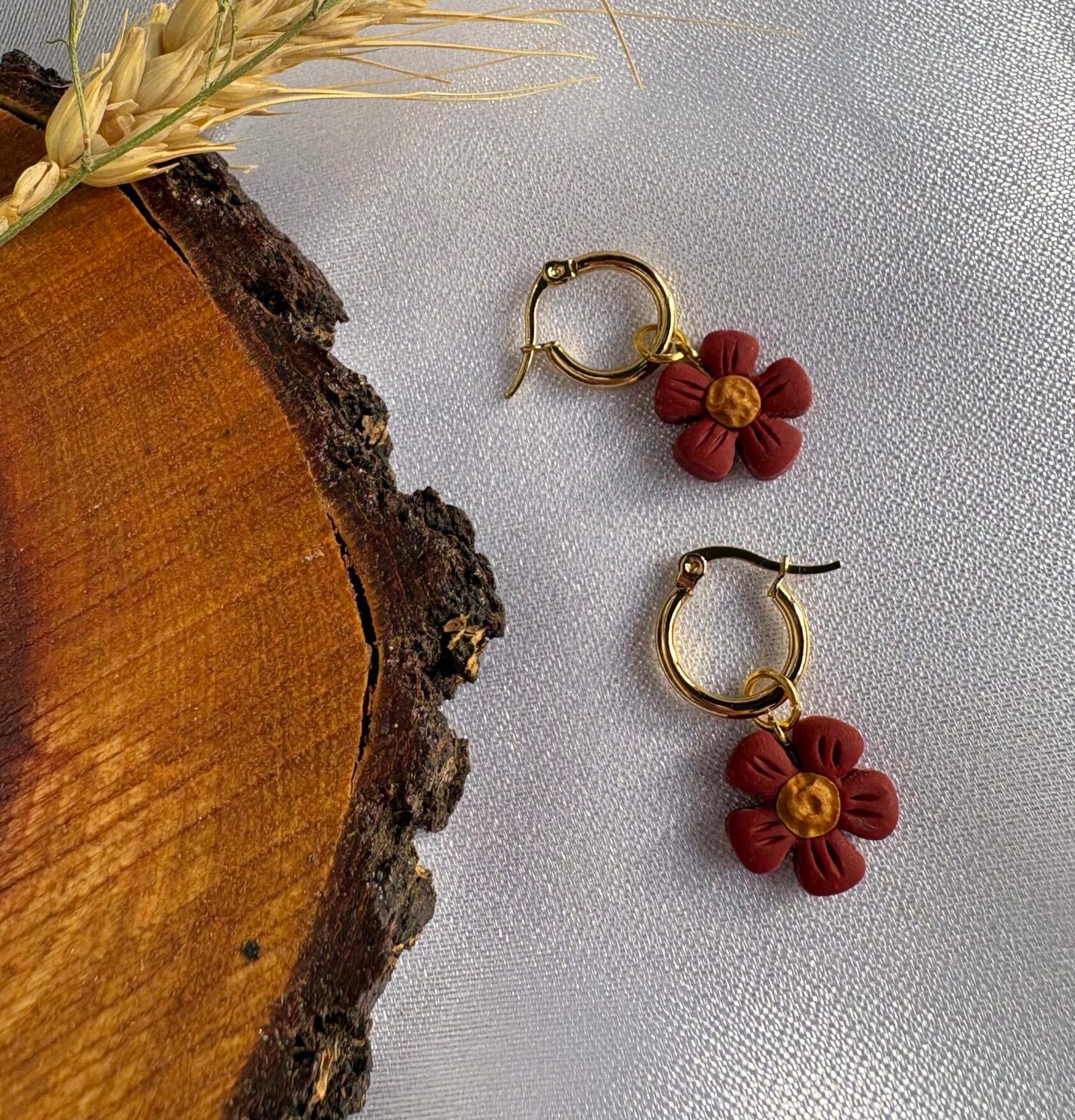 Pequeñas flores en tono terracota, modeladas a mano en arcilla polimérica y combinadas con un centro dorado que aporta calidez.