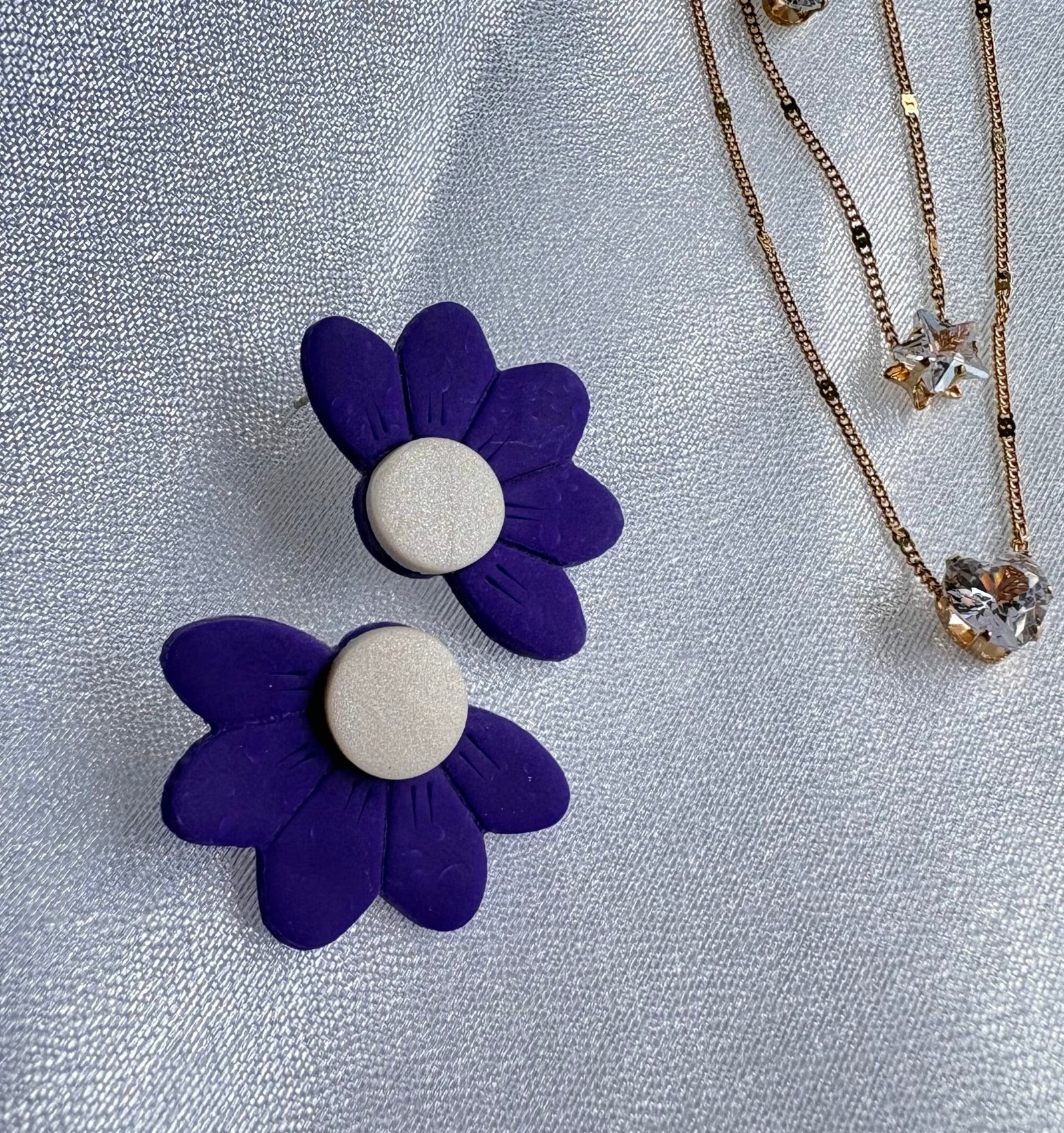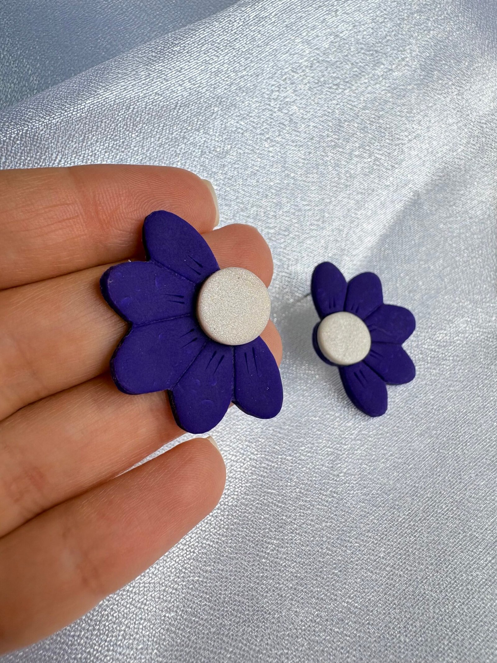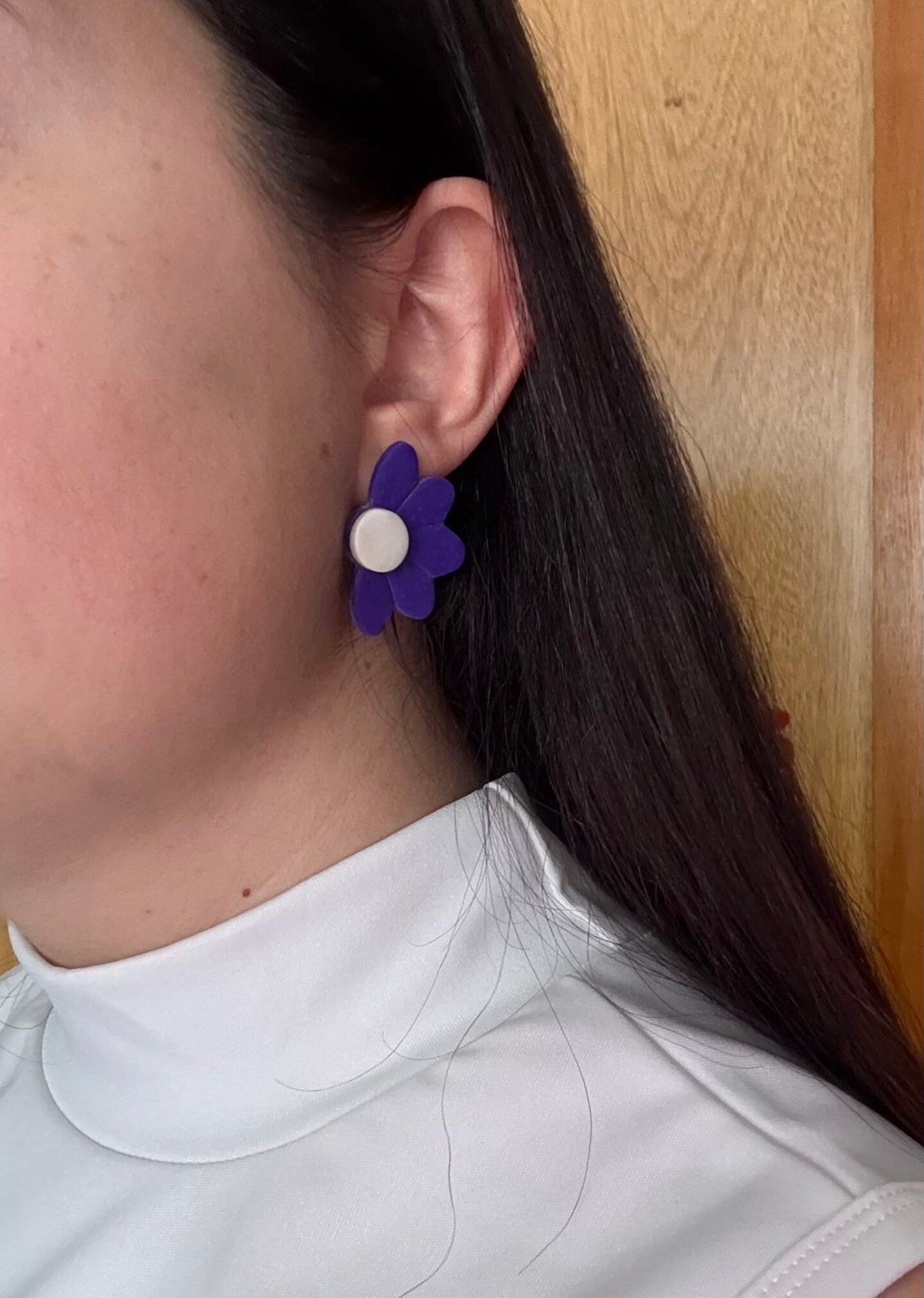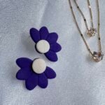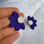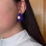 Caravana de media margarita en color violeta, con centro blanco nacarado. De 5 cm, es una pieza fina y delicada, ideal para usar tanto de día como de noche. Aporta un toque femenino y sutil a cualquier look.