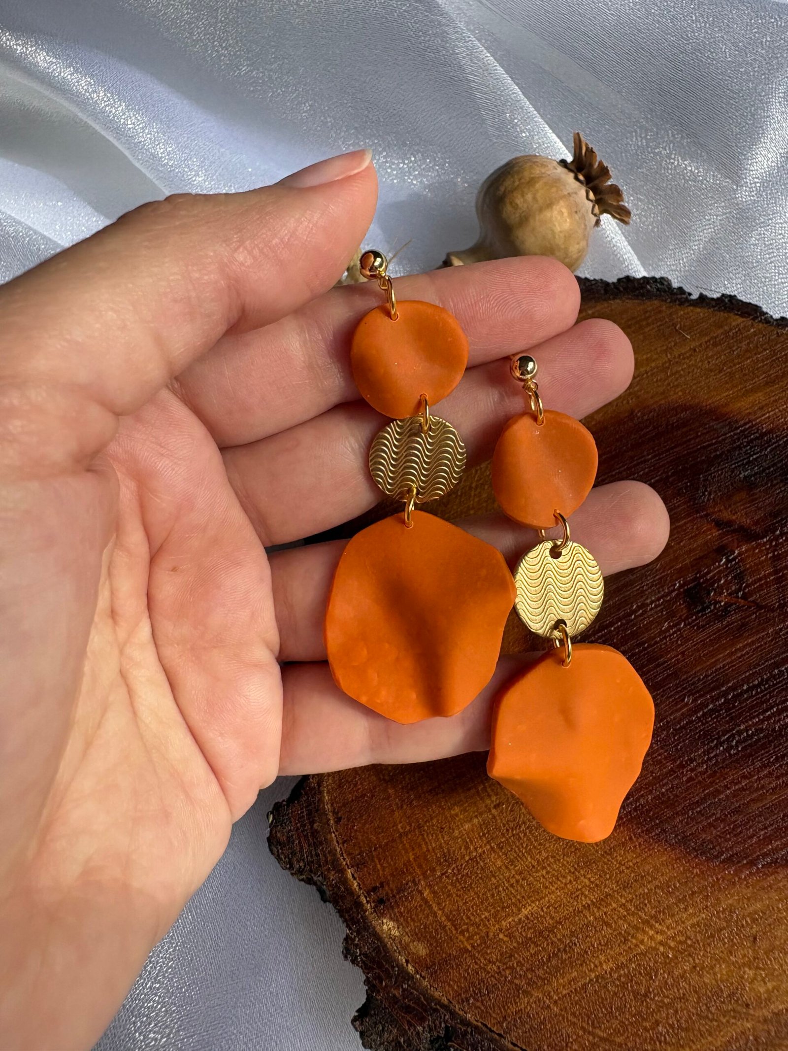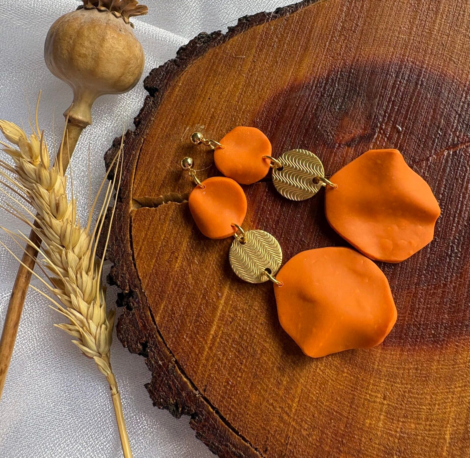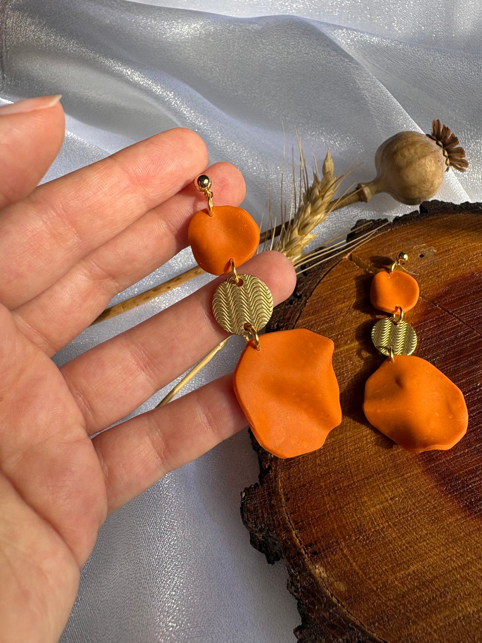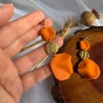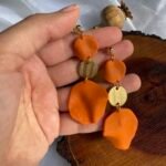 Accesorios inspirados en pétalos de flor en tonos naranjas, modelados a mano en arcilla polimérica y realzados con detalles dorados que capturan la luz.
