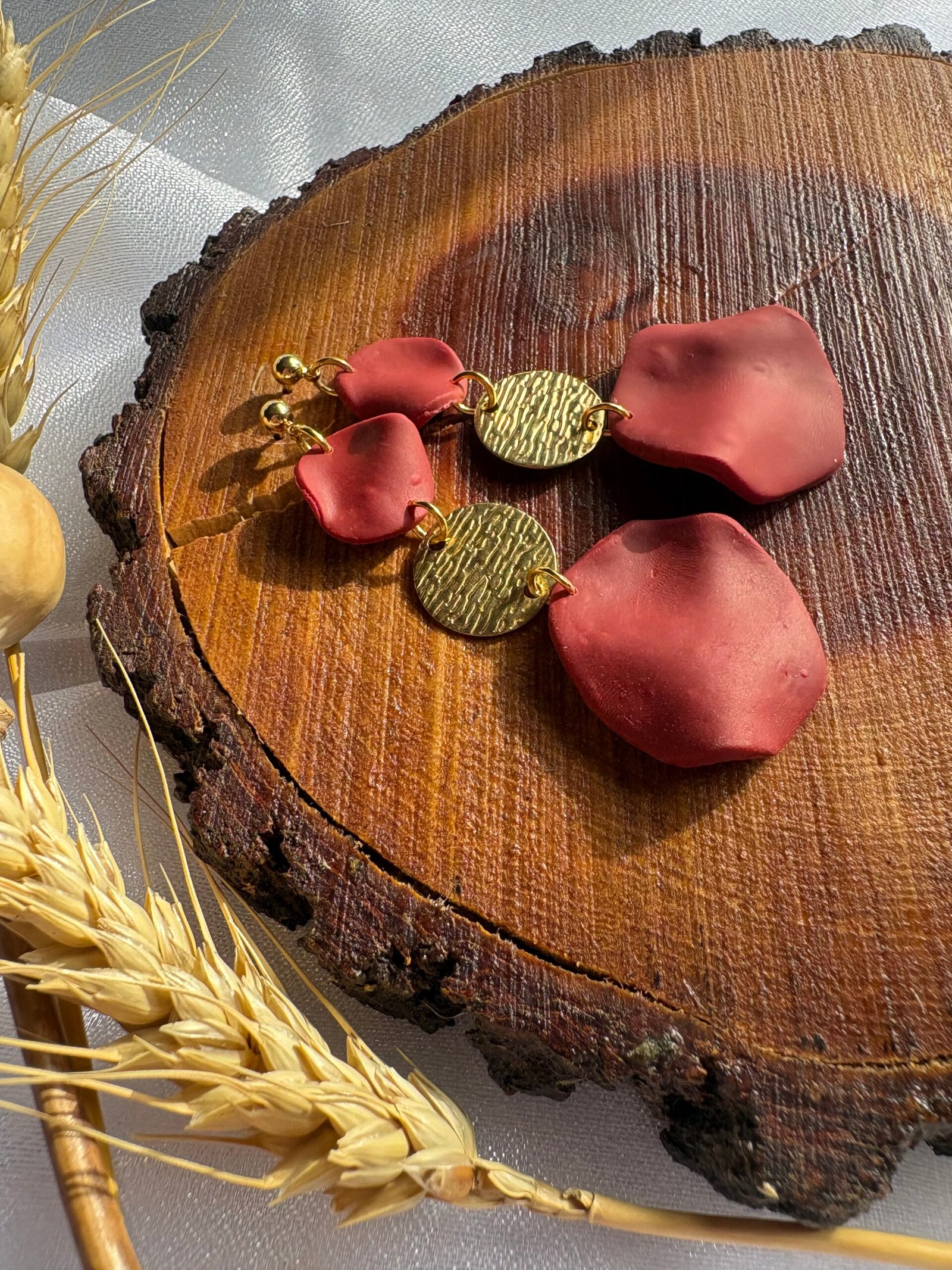 Accesorios inspirados en pétalos de flor en tono terracota, modelados a mano en arcilla polimérica y realzados con detalles dorados que capturan la luz.