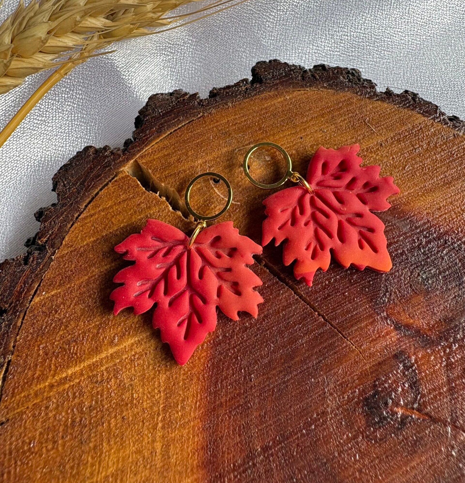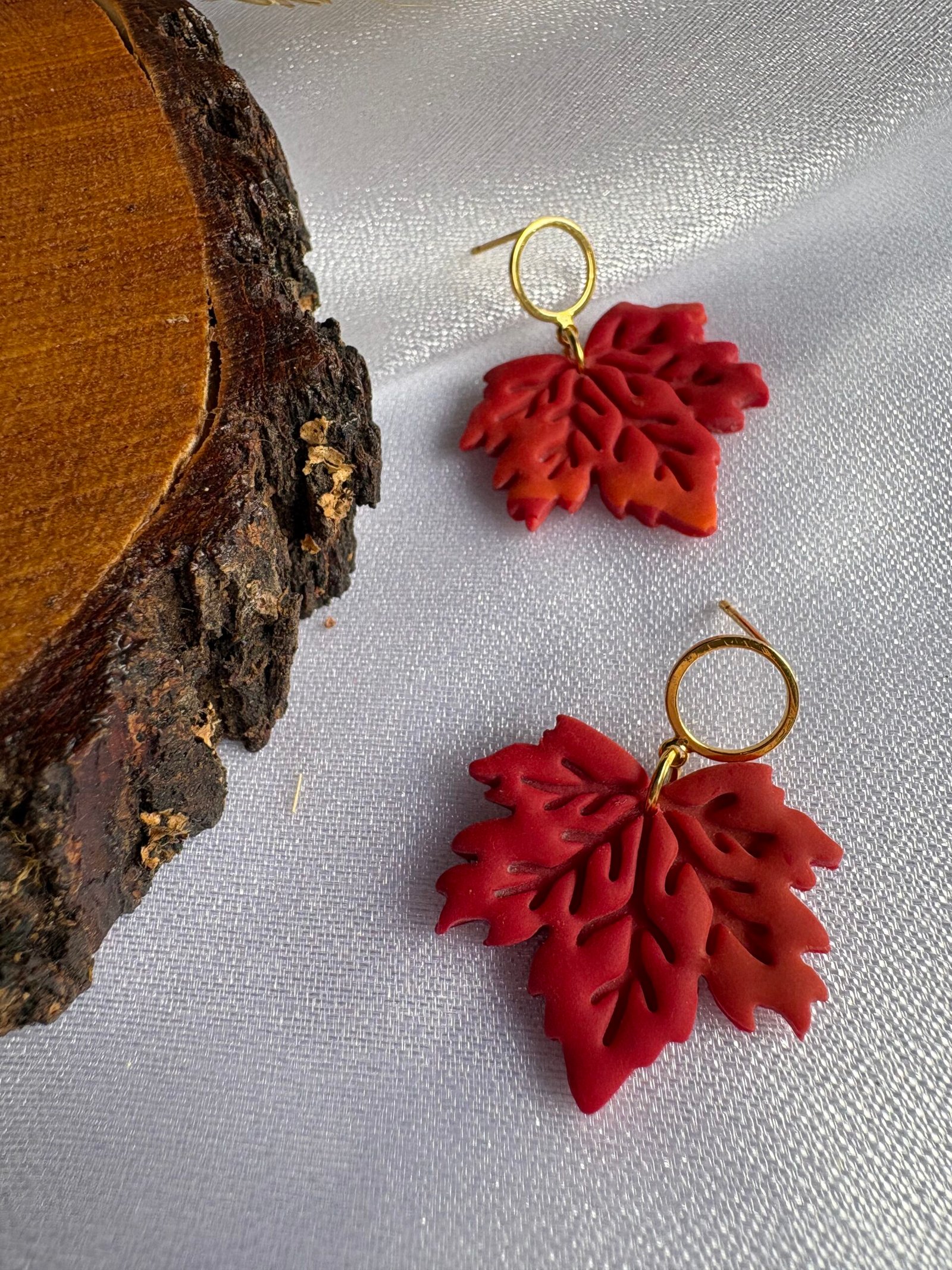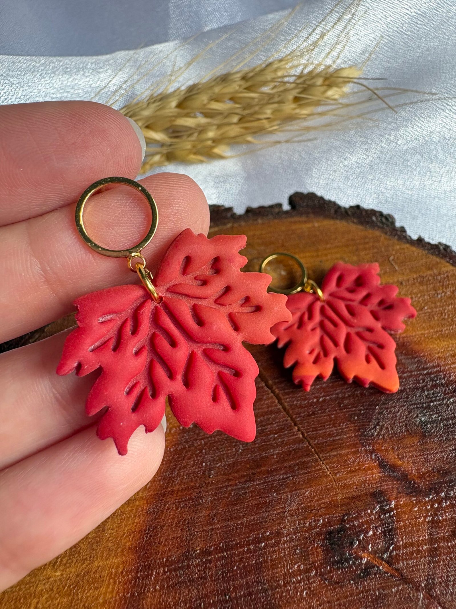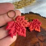Hojas de arce en tonos cálidos con efecto degradé, modeladas a mano en arcilla polimérica y realzadas con detalles sutiles que aportan profundidad.