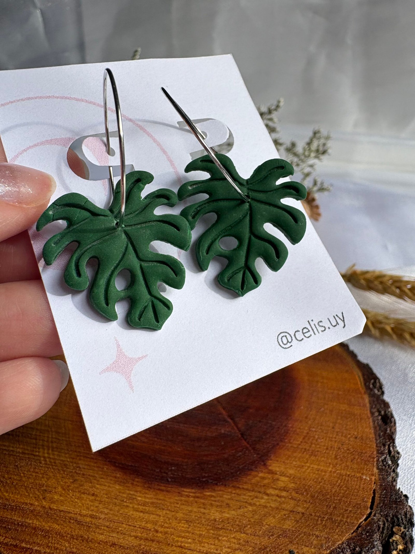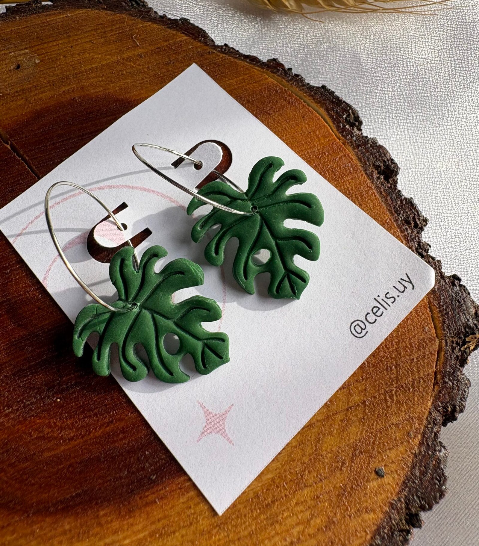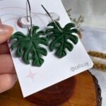 Monsteras modeladas a mano en arcilla polimérica y combinadas con la sutileza de los aros.