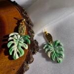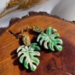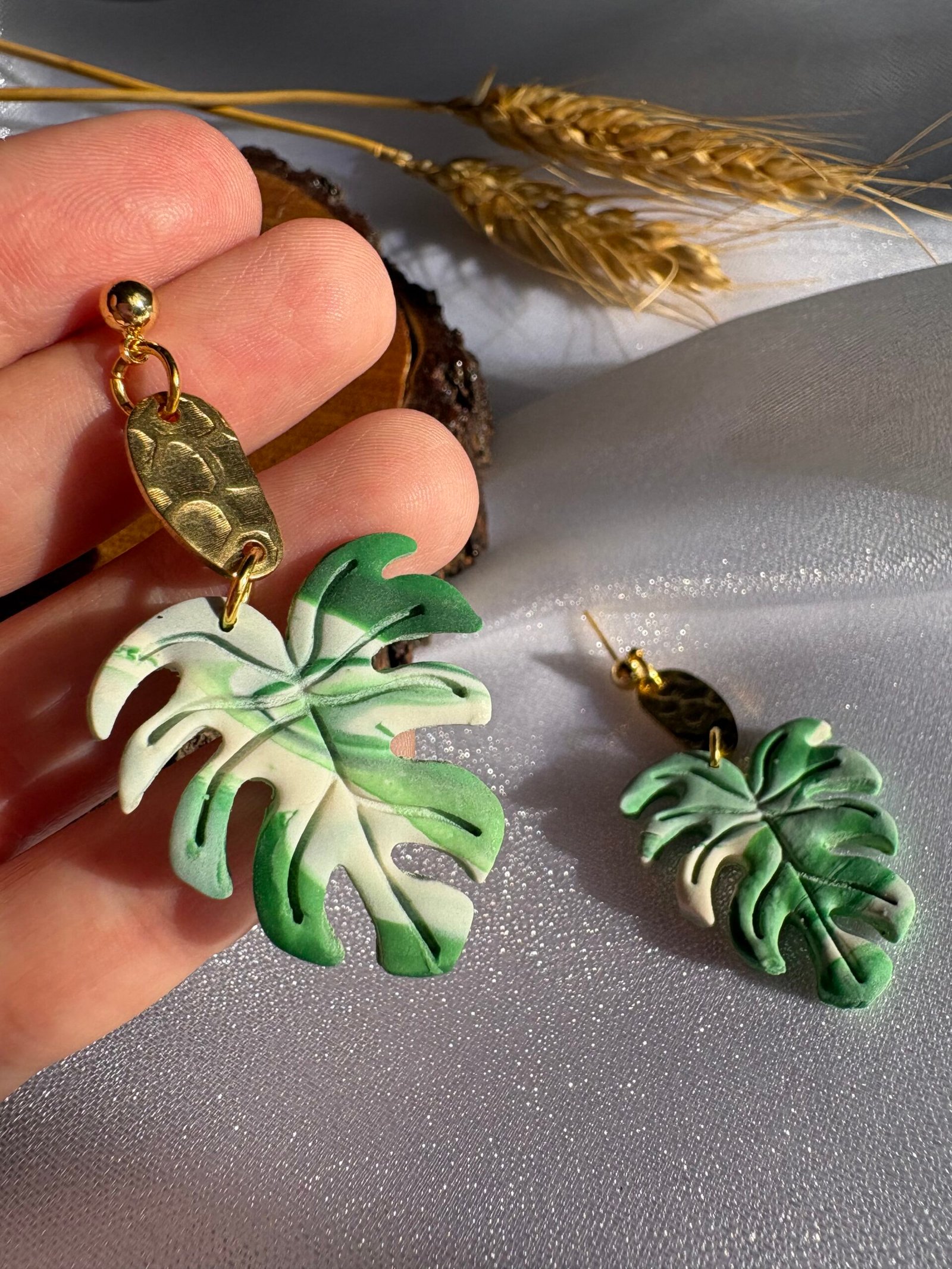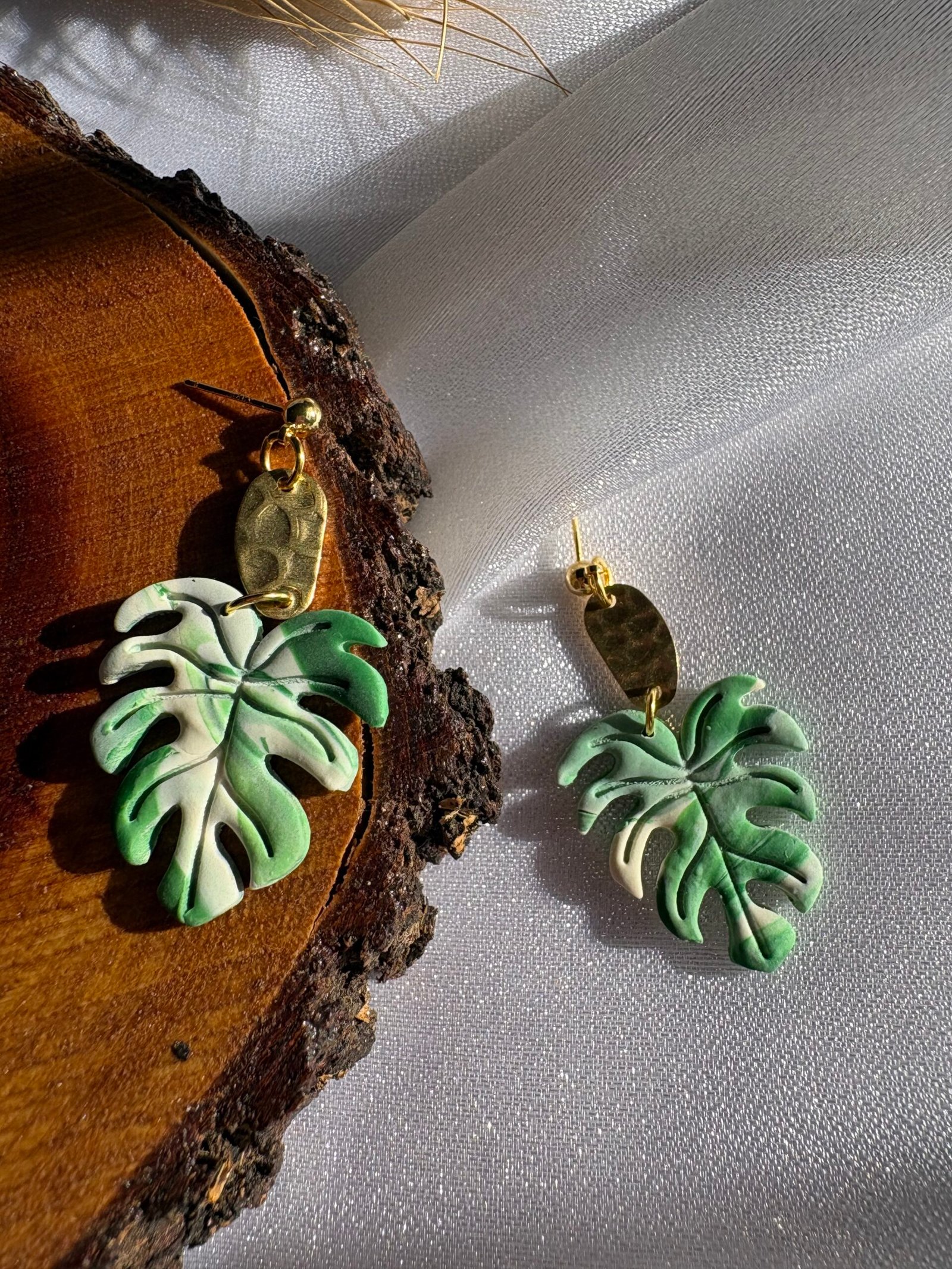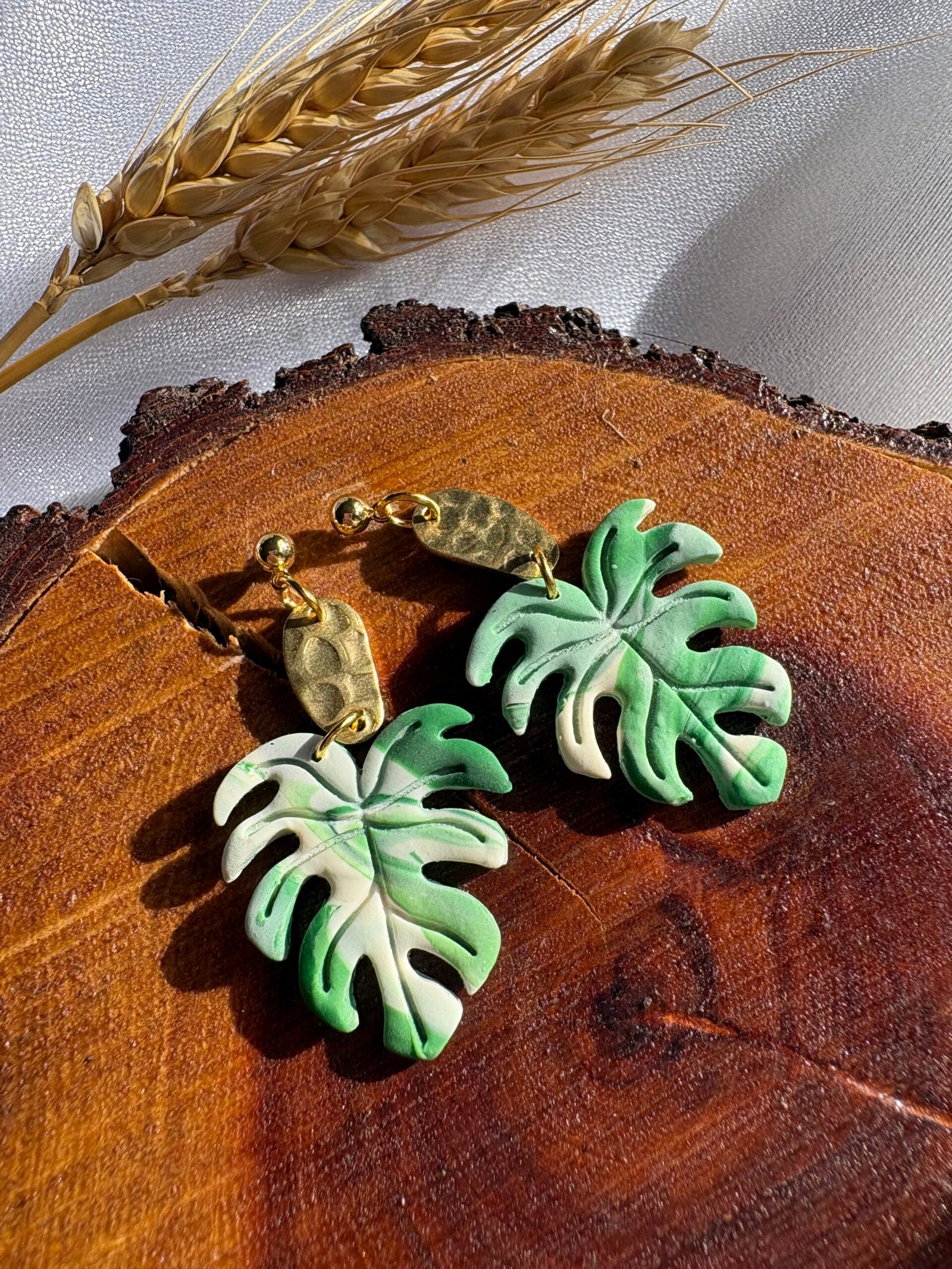 Hojas en tonos verdes con vetas únicas, modeladas a mano en arcilla polimérica y combinadas con detalles dorados.